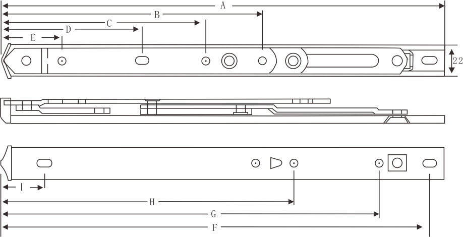 | 連桿數量 | 折片厚度(mm) | 規格\值 | A | B | C | D | E | F | G | H | I | 窗最高(mm) | 窗最寬(mm) | 窗最重(kg) | 開啟角度(±2°) | |||